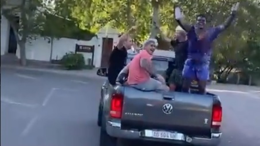 En las imágenes se puede ver cómo el joven va parado en la parte de atrás de la camioneta y que lleva una botella en la mano de derecha. El vehículo justo dobla en una esquina y el flamante recibido pierde el equilibrio.