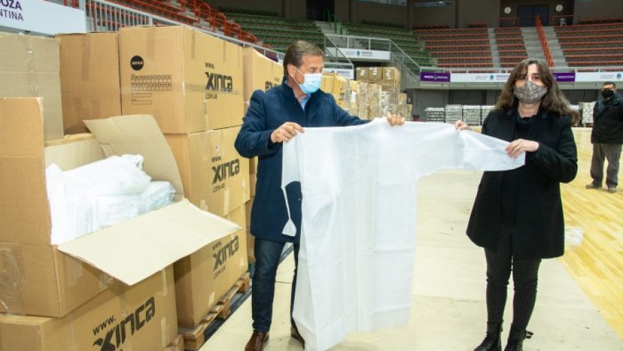 El Gobernador Rodolfo Suarez y la ministra de Salud Ana María Nadal recorrieron este miércoles las instalaciones del emblemático Aconcagua Arena, hoy preparado para funcionar como depósito de insumos que compró el Estado para la lucha contra el coronavirus.